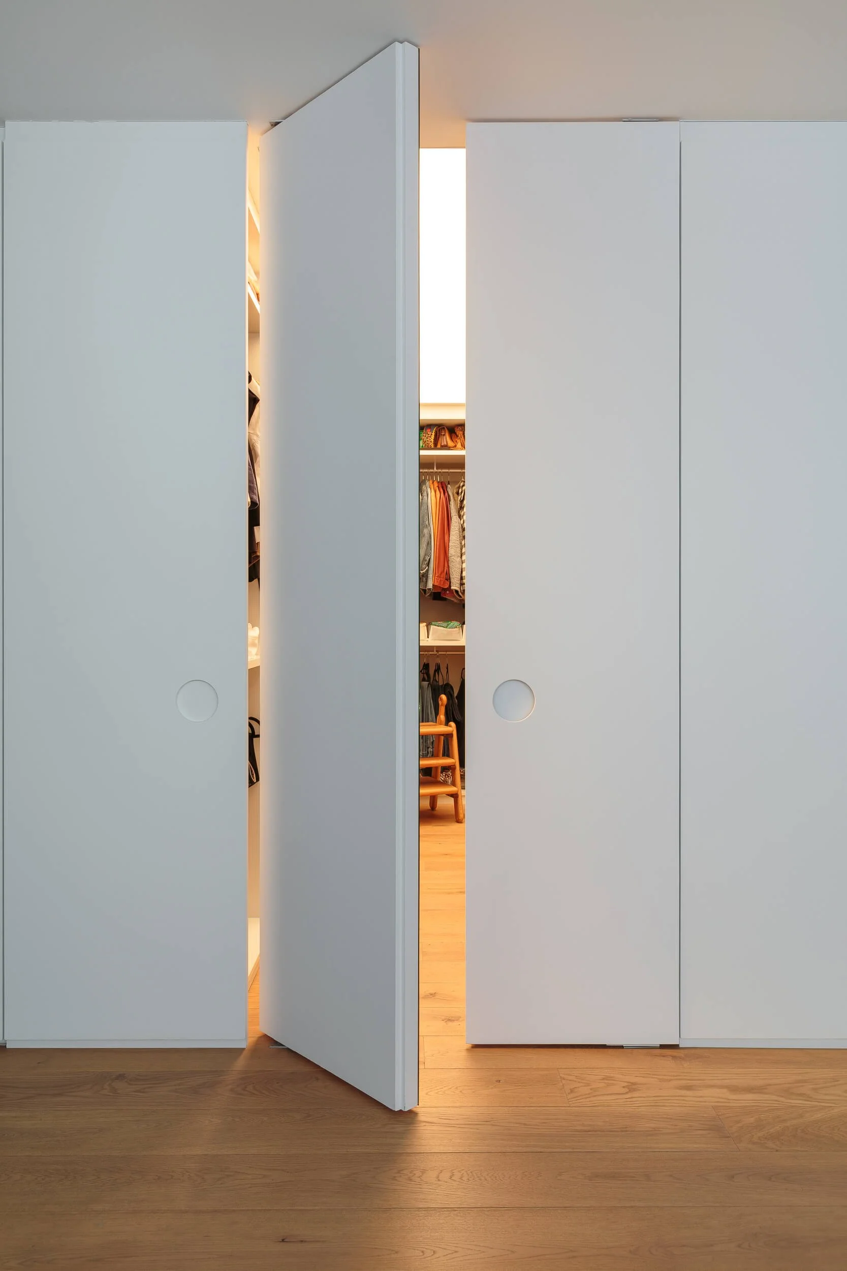 A cozinha tem uma luz focada nas bancadas de trabalho e armários. No lavabo, que não tem janela, fizemos uma sanca para trazer a sensação de iluminação natural. E o hall de entrada ganhou uma luminária indireta decorativa. As obras de arte tem sempre seus spots focados destacando-as.