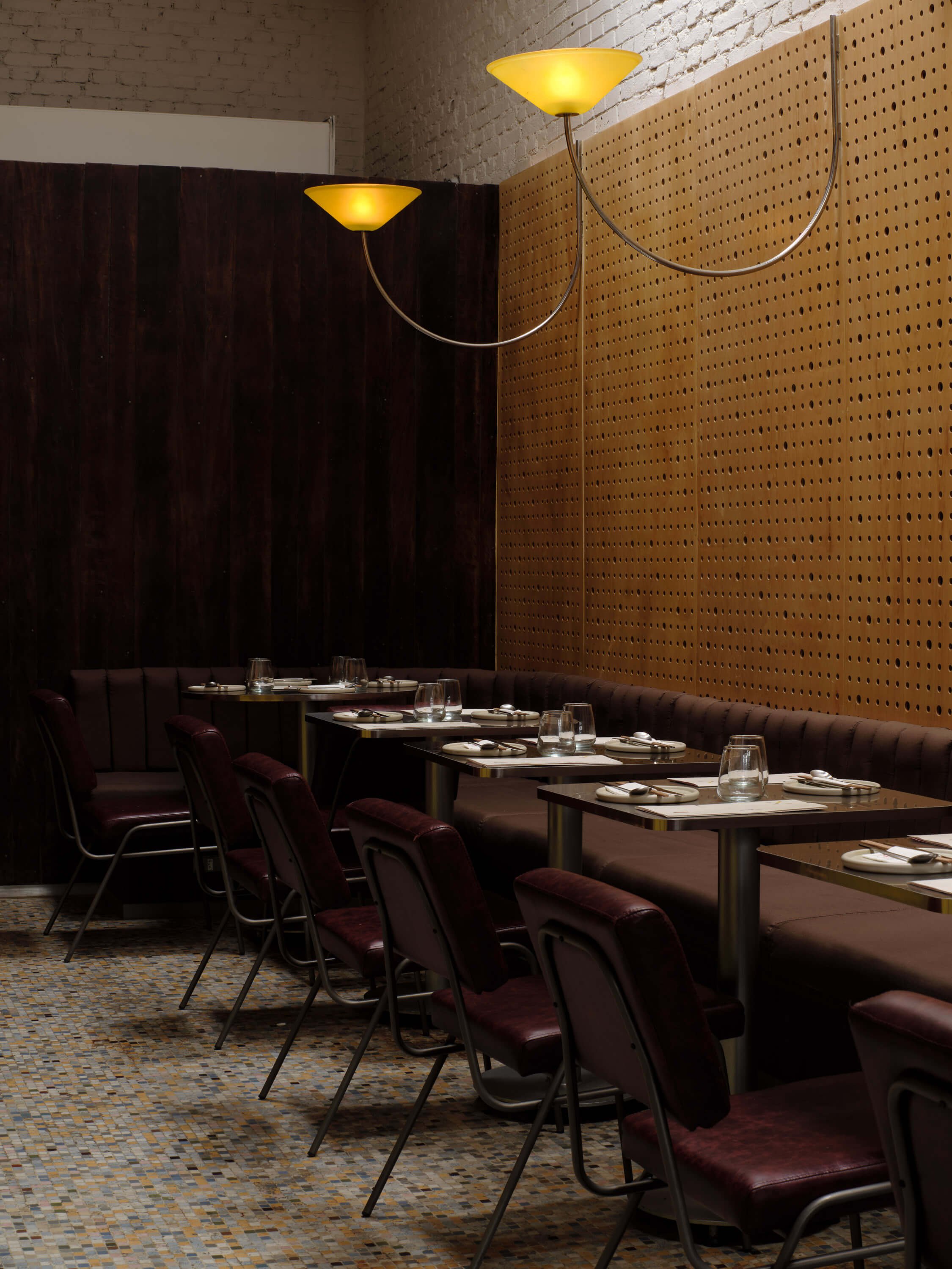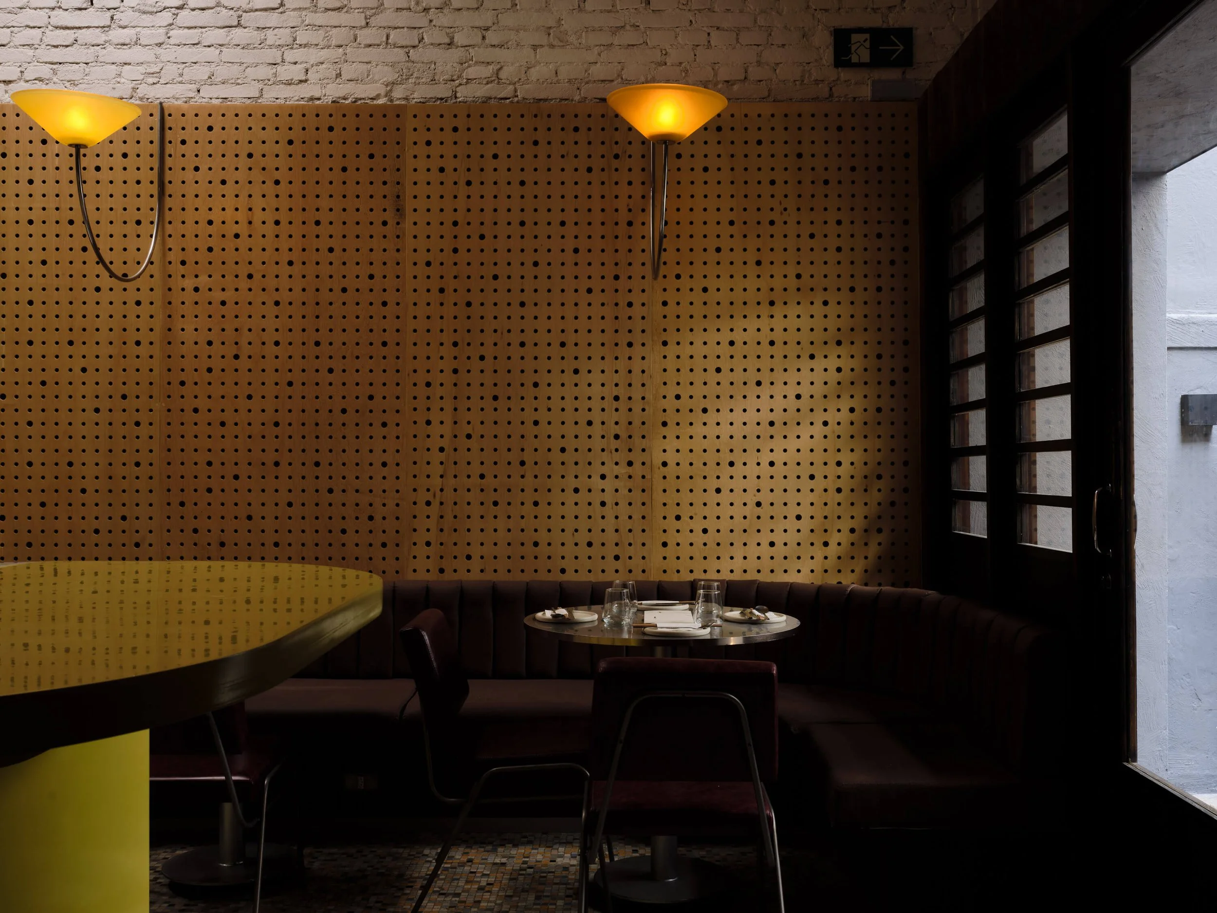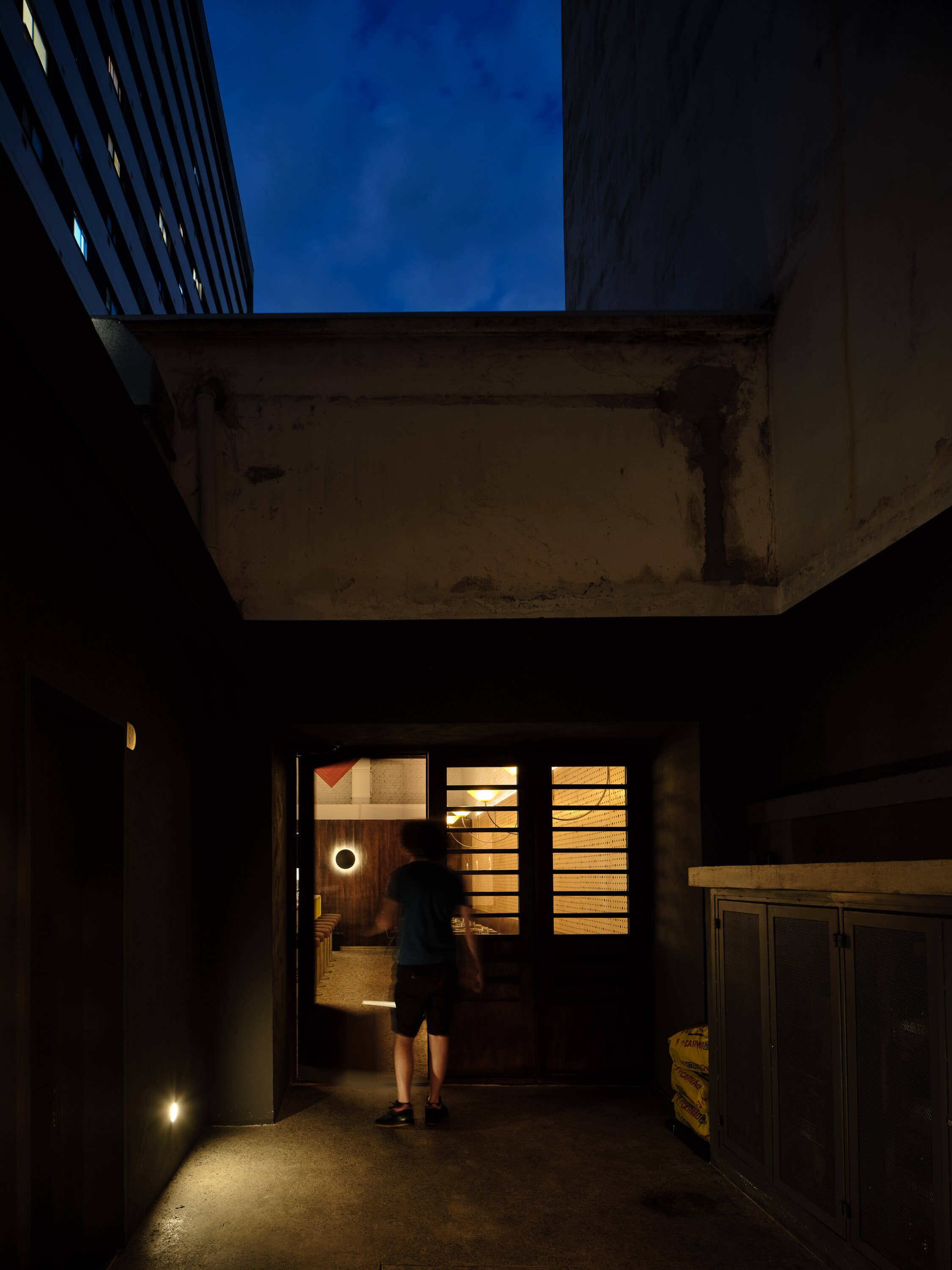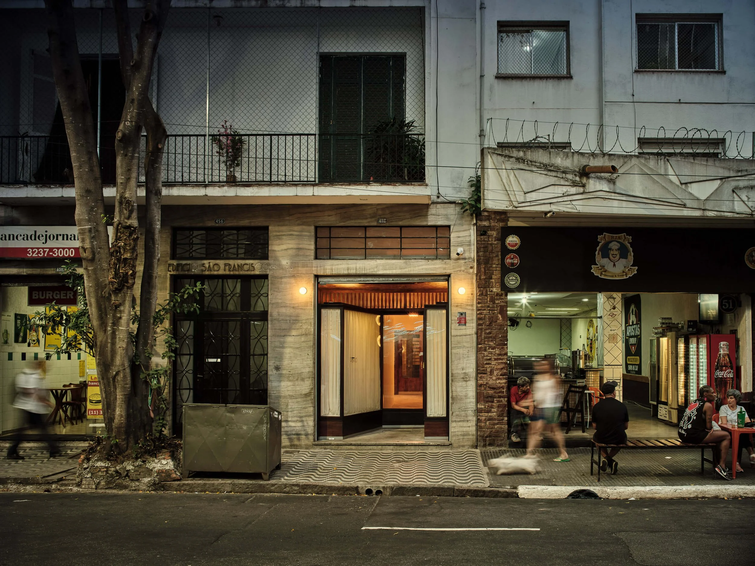 A fachada, vitrine histórica de uma antiga sapataria, ganhou protagonismo com uma iluminação quente e difusa atrás de uma cortina. O efeito “caixa de luz" gera um destaque e a fachada se contrasta dos imóveis vizinhos. Todas as arandelas foram desenhadas e produzidas para o projeto, e o pendente da área de chegada, peça da antiga loja, foi redesenhado e adaptado para o novo bar.